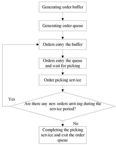 (4) The order queue accepts the picking service according to (a) first-come, first-served (FCFS) rules and (b) the gated service discipline, as shown in Figure 3: the discipline requires that the picking machine only sort the orders that enter the queue before starting the service; therefore, the other orders are delayed until the next processing.