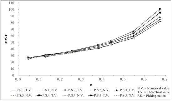 (3) Under a low system load, the differences in the picking stations’ MWT were too small and not obvious. This means that the arrival rate hardly affected the waiting time of the picking system in the case of a low system load. However, with the growth in the system load, the differences in the picking stations’ MWT also increased and the effect of the differences in the picking stations’ arrival rates on the MWT gradually became apparent. This indicates that the picking system could better identify the stochastic characteristics of the order queues under a high load and is more flexible in actual situations.