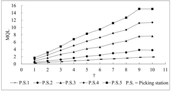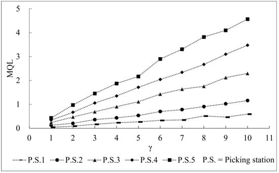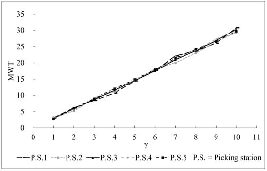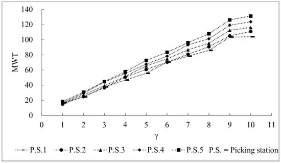 (2) With the increase in the λβ and γ, the MQL and MWT also grew correspondingly. This shows that these stochastic characteristics (λiβi and γi) have an important impact on the performance of the picking system. The higher system load and longer switching times of a picking service can increase the queue length and waiting time of a picking system. In addition, the differences in the picking stations’ MQL were larger than that of the picking stations’ MWT with the increase in the system load, which could be due to the order arrival rate’s greater impact on the length of the order queue.