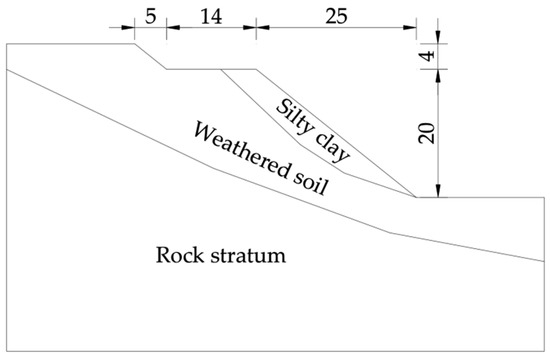 This slope is located in a section of a railway in transition from hills to mountains. The height of the slope is 20 m, and the gradient is 1:1.25. By geological exploration of the engineering site, the distribution of soil layers is shown in Figure 1. The upper part of the slope has a weak soil layer and a sliding surface, which is a potential source of slope instability, while the lower part is a relatively stable rock layer. Anti-slip piles are suitable to reinforce such slopes with obvious sliding surfaces and weak upper soil layers but stable lower parts [18]. Therefore, double-row anti-slip piles were used to reinforce the slope to prevent the sliding of the land and improve the overall stability of the slope.
