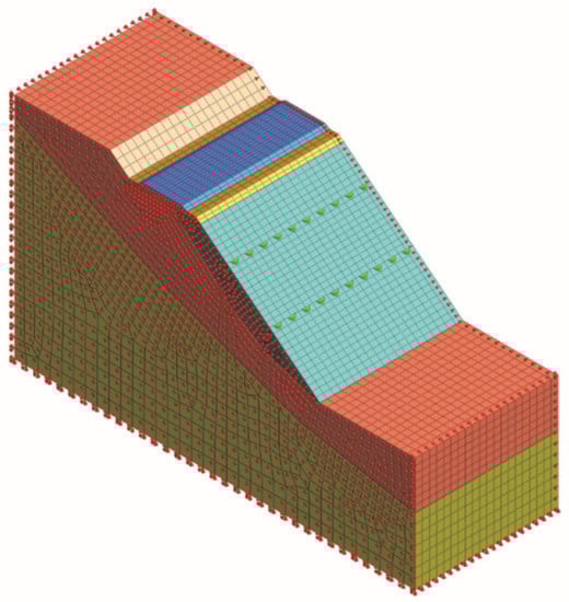 The height, width, and thickness of the slope model were 48 m, 84 m, and 30 m respectively. A hybrid grid generator was used to create the grid cells, with the model grid size ranging from approximately 0.75 m to 2 m. The grid at the train load and the slope face was relatively dense, while the grid at the bottom of the model was relatively sparse. The anti-slip piles were simulated with 1D beam cells, while all other materials were simulated with 3D cells. The horizontal and vertical displacements were constrained at the base of the model, and the horizontal displacements were constrained at the sides. The slope model is shown in Figure 2.