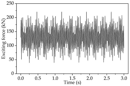 A train load is affected by the bearing weight, track irregularity, running speed, and subgrade characteristics. The dynamic load of a moving train can be simulated by the excitation force function [20] and the following mathematical expression: