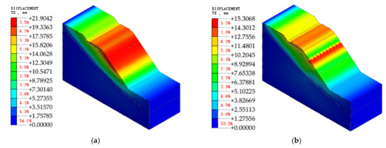 (a) Lateral displacement nephogram of slope mode before reinforcement. (b) Lateral displacement nephogram of slope mode after reinforcement.