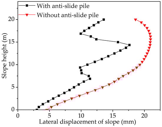 After the slope was reinforced by anti-slip piles, the lateral displacement also decreased accordingly. When the slope height was about 9 m and 17 m, the lateral displacement of the slope reached its minimum value, which rapidly decreases to about 9.8 mm. These two places were located near the anti-slip pile, so the slope was more constrained by the anti-slip pile than at other locations. In the slope away from the anti-slip pile, with the gradual elimination of the anti-slip pile supporting effect, the lateral displacement of the slope also began to increase, but it was still lower than the corresponding slope without support. The maximum of slope lateral displacement was 15.3 mm, which was located at the height of 14.5 m. Compared with before reinforcement, the maximum lateral displacement of the slope was reduced by 27.5%. Overall, the anti-slip pile had a certain constraint on the lateral displacement of the slope.