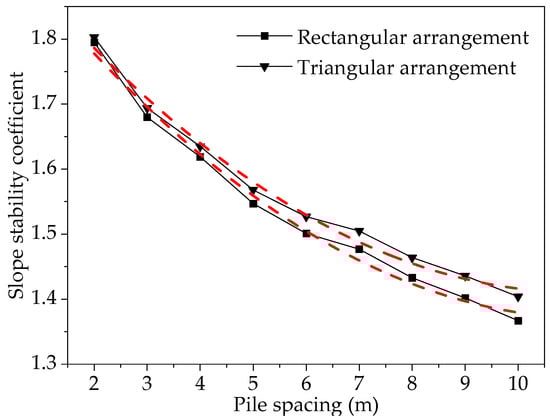 Taking the rectangular arrangement as an example, the slope stability coefficient was 1.795 when the anti-slip pile spacing was 2 m. When the anti-slip pile spacing was increased to 10 m, the corresponding slope stability coefficient was 1.367, which was slightly higher than Fst = 1.35, and actual pile spacing rarely reaches 10 m. The reinforcement effect of anti-slip piles with a triangular arrangement was slightly better than that of a rectangular arrangement. The larger the pile spacing, the more significant the difference between the two types of arrangements.