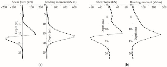 (a) Shear and bending moment diagram of upper row piles. (b) Shear and bending moment diagram of lower row piles.