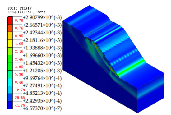 In addition, the extent of the plastic zone was also significantly reduced, as shown in Figure 14. The maximum plastic strain was located at the junction of the weathered soil and rock strata, corresponding to 1.58 × 10−3, which was 46.3% lower than that of 2.94 × 10−3 without reinforcement. The plastic zone of the slope after the anti-slip pile reinforcement was mainly located at the intersection of the rock and soil and behind the anti-slip piles. The stability coefficient of the slope under seismic load was 1.304, which was greater than the corresponding safety factor, Fst = 1.15 [21]. The slope remained safe after an earthquake of this intensity.