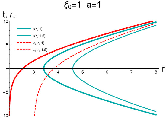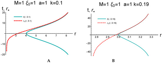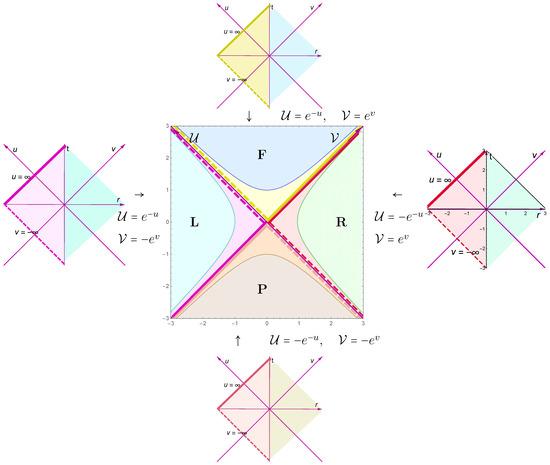 One can see that the metric (22) admits an extension to the region . In this case, by using Formula (45), the coordinate r is extended to the region ; see Figure 1.