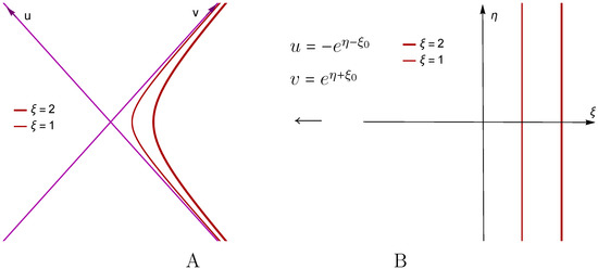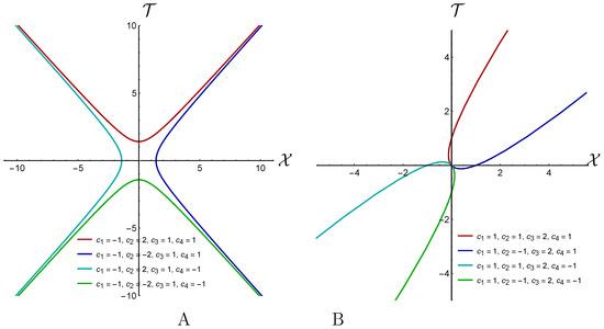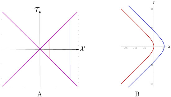 In Figure 4A,B, we plot trajectories with (red) and (blue) in the and planes, respectively. We can parameterize these trajectories in the Minkowski coordinatesby :