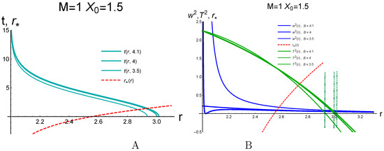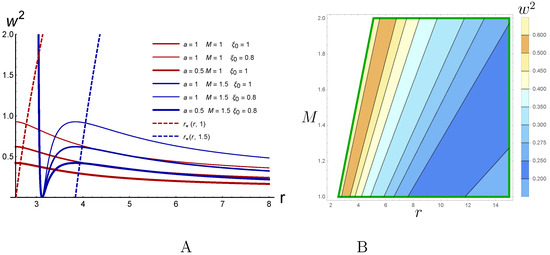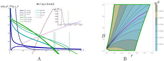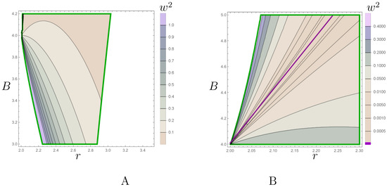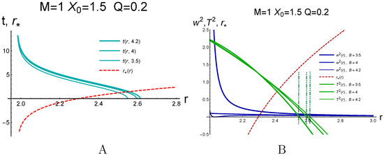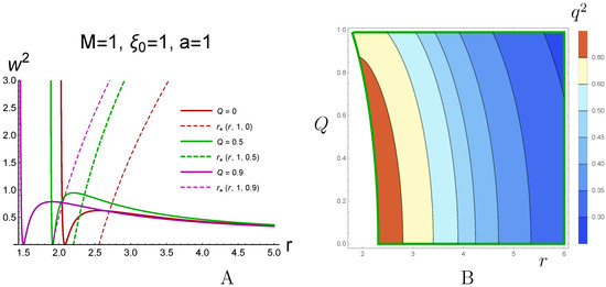 (A) as a function of r along the trajectories with for different Q. The physically acceptable regions are on the right of the dashed lines, shown as ; here, . (B) Contour plot of (A) for varying r and Q, . The physically acceptable domain is bounded by the green line. We see that the character of the acceleration dependence on r is the same as for the Schwarzschild case shown in Figure 14.