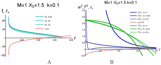 Figure 2. Geodesics for different values of . (A) For all lines and for dark red line , , for blue line , , for green line , and for cyan line , . (B) For all lines and for dark red line , , for blue line , , for green line , and for cyan line , . - . In this case, one “end” of the geodesics is at infinity and the second one is at zero; see, for example, the plot in Figure 2B.