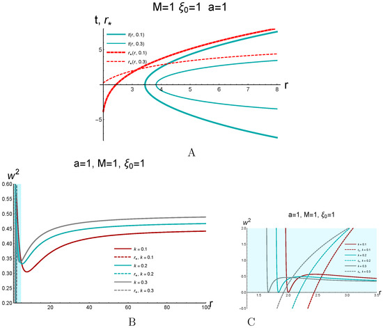 (A) Trajectories in the AdS-Schwarzschild spacetime in the Schwarzschild coordinates corresponding to the observer with the fixed space coordinate in the coordinates; acceleration vs. r for the trajectories shown in (A) for different values of k; (C) zoom of (B).