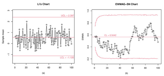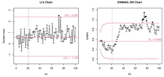 As can be observed in Figure 2, Li’s chart only signals at the 72nd monitoring moment, while the EWMAG-SN chart shows alarms in samples 72 up to 79 as well as 89. If it were not for the single true signal of Li’s chart, it could be said that the pattern of dots it exhibits is more consistent with that of an in-control process. Meanwhile, although the EWMAG-SN chart begins signaling at the same time as Li’s chart, the shift in the mean level of theprocess is evident much earlier.