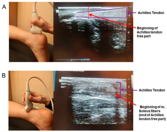 The occurrence of previous injuries is also a significant aspect in the examination of Achilles tendon functionality. A rupture or tear to this tendon may reduce its functional activity, although this may cause it to lengthen []. Carmont et al. [] examined 26 patients following injury, post-surgery as well as during rehabilitation (6 weeks after surgery; 3, 6, 9 and 12 months), and reported increased tendon lengths after injury, which decreased after surgery and then increased again during rehabilitation. In this study, the importance of precise and sensitive measurements of the Achilles tendon length at each step of the treatment following injury was illustrated. The ultrasound imaging used in our study seems to be an appropriate method to be implemented for this purpose. This relationship may be also of significance during the selection of proper and effective methods of training or physiotherapy in people with a limited range of ankle joint dorsiflexion. However, if the tendon length is a potential factor limiting mobility, the same methods for increasing the range of motion may not be effective for everyone. Therefore, it is necessary to assess the length of the free part of the Achilles tendon in people undergoing therapy for dorsiflexion restriction, in order to select appropriate treatment methods.