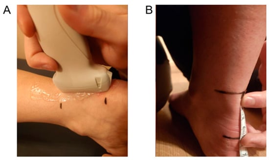 Measurement of Achilles tendon length can be performed using indirect methods (such as measuring resting angle of the ankle joint in the Achilles tendon length measure (ATLM) and Achilles tendon resting angle (ATRA) tests), and by direct methods, such as magnetic resonance imaging (MRI), ultrasonography (USG), or calculating the length of the tendon isolated post mortem [,,]. The methods of musculoskeletal system evaluation must be sensitive enough and allow for the detection of even minor abnormalities (e.g., asymmetries). One such method is ultrasonographic imaging of the musculoskeletal system. It has been reported that USG is an effective and reproducible method for measuring the length of the Achilles tendon, as well as its free part [,,]. The great advantage of ultrasound is its general availability, low cost, and the possibility of carrying out mobile examinations. Barfod et al. [], in a group of 19, non-injured patients, examined both lower limbs using MRI (magnetic resonance imaging) and ultrasound. They reported that the results obtained by three independent examiners using ultrasound were reliable and comparable with those achieved using MRI. They further underlined that using ultrasound examination among the non-traumatized patients made it possible to detect differences between right and left tendons greater than 4 mm []. It was also suggested that ultrasound imaging is a useful method for examining the length of the free part of the Achilles tendon [,,,]. The range of ankle joint motion may be determined with a goniometer or a WBLT. Both of these methods are widely used and considered reliable [,,]. A goniometer is a basic tool for examining the range of motion in the joints [], while WBLT is the preferred method applied for measuring functional dorsiflexion of the ankle []. It is also one of the basic functional tests used for dorsiflexion assessment after ankle and Achilles tendon injuries [].