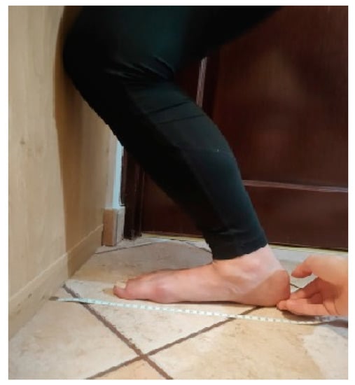 During the WBLT, the subject was positioned on their front lower limb with 10 cm from the wall to the tip of their toes. The back lower limb was positioned by the subject in such a way that they could stand in a stable and comfortable position. In this position, by bending the knee along the axis of the lower limb, they tried to touch the wall without taking their heel off the ground. If the heel lifted, the distance to the wall was shortened until the heel did not lift. If the heel did not rise, the distance was gradually increased until the heel rose and the final distance at which the heel did not lift was marked (Figure 4) []. The final distance between the tip of the toes and the wall was measured in cm; therefore, a longer distance indicated a higher ankle joint dorsiflexion. Two repetitions of WBLT were performed and the higher score was analyzed.