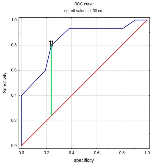Statistical analysis was performed using STATISTICA 13.0 Pl software. The data distribution was evaluated with the Shapiro–Wilk test. The t-test for independent samples was applied to determine differences between groups. Additionally, Pearson’s linear correlation coefficient (r) was calculated (below 0.50—“poor”; between 0.50 and 0.75—“moderate”; between 0.75 and 0.90—“good”; above 0.90—“excellent”) []. For all variables, sensitivity, specificity, ROC (receiver–operator characteristics) curve, and cut-off values were also calculated []. The variability within each data set was described using the arithmetic mean and standard deviation (SD) with 95% confidence intervals (95%CI), coefficients of variation (CV), and standard error of the mean (SEM). The effect size (ES) was calculated using Cohen’s d and interpreted as small (0.2–0.3), medium (0.5), or large (>0.8). Differences were considered statistically significant at a level of (p < 0.05).
