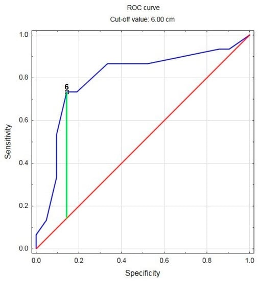 The sensitivity (0.800) and specificity (0.762) of the WBLT indicated a cut-off value at 11 cm on the ROC (receiver–operator characteristics) curve. This means that WBLT results below 11 cm were strongly related to a higher range of dorsiflexion in the ankle joint. WBLT results above 11 cm demonstrated a higher specificity (close to 1); therefore, they were not indicative enough for a higher range of ankle dorsiflexion (Figure 5. The sensitivity (0.733) and specificity (0.857) of Achilles tendon length for a cut-off value of 6 cm on the ROC curve suggested that a tendon length below 6 cm was strongly related to a higher range of ankle dorsiflexion, but a tendon length above 6 cm did not indicate a higher range of ankle dorsiflexion (Figure 6).