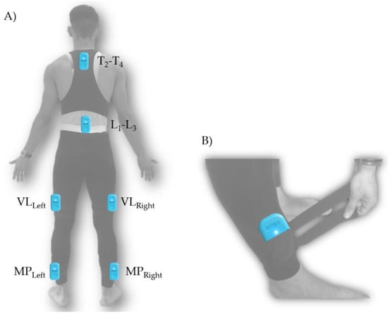 Six MARG sensors were attached, as shown in Figure 2. The MARG’s sensors were inserted in the pockets of special spandex suit pants and adjusted using a Velcro system. This attachment system was used to avoid the device’s unwanted shaking or vibration []. The devices were attached considering previous studies in running protocols [,]. One device was located at the second and fourth thoracic vertebrae (~T2–T4). One was located at the first to third lumbar vertebrae (~L1–L3) level. Two devices were attached to bilateral vastus lateralis muscle bellies (VLright and VLleft), and two devices were fixed to the bilateral 3 cm cephalic from the malleolus peroneus (MPright and MPleft).