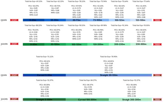 The PCAs of 150 m and 300 m segments explained 62.33–78.15% and 88.22–93.05% of the total variance of the six MARG sensors. The PC one explained 40.72–61.45% in 150 m track segments and 83.07–85.96% in 300 m segments. It has to be highlighted that the curved track segments were represented by VLright, VLleft, MPright and MPleft, whereas VLright explained the straight track segments, VLleft, MPright, MPleft and L1–L3 (see Figure 3).