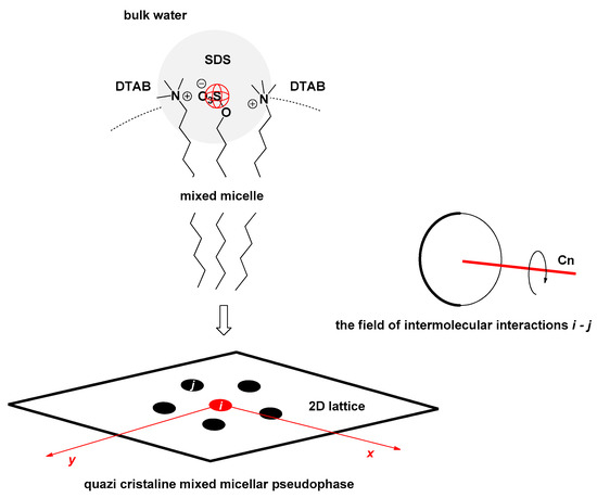 Micelle section: binary mixed micelle is formed by classic surfactants, cationic surfactant dodecyl trimethylammonium bromide (DTAB = j), and anionic surfactant sodium dodecyl sulfate (SDS = i); in the 2D representation of the micellar pseudophase (2D lattice), whether SDS or DTAB is chosen as the central particle, there are identical intermolecular interactions between the first neighbors of the different types of surfactants in each spatial direction—the field of intermolecular interactions of the first neighbors i−j is characterized by the symmetry axis Cn where n = ∞.
