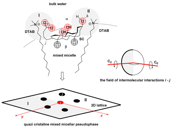 A binary mixed micelle is formed by the classic (cationic) surfactant dodecyl trimethylammonium bromide (DTAB = j) and the anion of cholic acid (SC = i); in the 2D representation of the micellar pseudophase (2D lattice) in the vicinity of the SC (SC as the central particle), there are two particular regions of intermolecular interactions: the first (I) in the vicinity of the carboxylate function and the second (II) in the vicinity of the C3 α pseudo-axial OH group—the field of intermolecular interactions of the first neighbors i−j is characterized by the axis of symmetry of the second order C2.