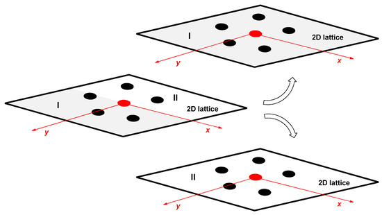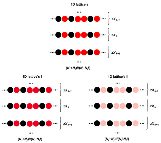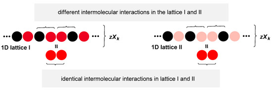 The total energy of the k-th microstate of the global 1D lattice is the sum of the energies of the 1D lattice I and 1D lattice II, where care should be taken that the energy of intermolecular interactions between the identical particles is taken into account only once since both and contain this energy (Figure 11):