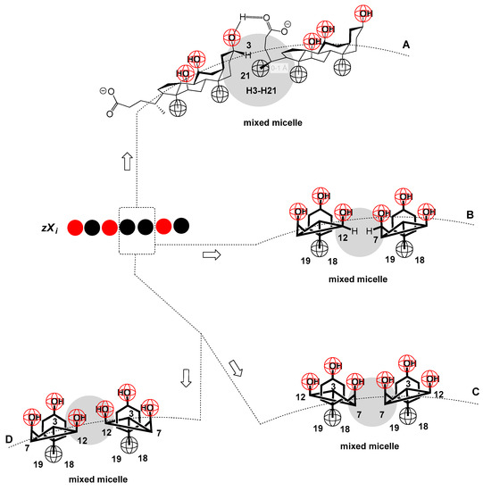 In binary mixed micelles of classic surfactants and bile acid salts, the steroid skeleton of bile acid anions occupies a position where its convex surface (hydrophobic surface) faces the hydrophobic core of the micelle formed by the hydrocarbon chains of the classic surfactant. Its concave surface (hydrophilic surface) faces an aqueous solution [32]. This spatial orientation of bile acid anions (for example, SC, Figure 3) allows the particles of classic surfactants (for example, DTAB, Figure 3) to simultaneously form intermolecular interactions both with the carboxylate function and with the OH groups of the bile acid anions, especially if the OH groups are axial (because then the spatial orientation of the OH group is parallel to the spatial orientation of the classic surfactant with an elongated conformation of the hydrocarbon chain, Figure 3). However, the formation of intermolecular interactions between steroid OH groups and the classic surfactant is also influenced by the steric environment of the OH group, i.e., their sternal shielding.