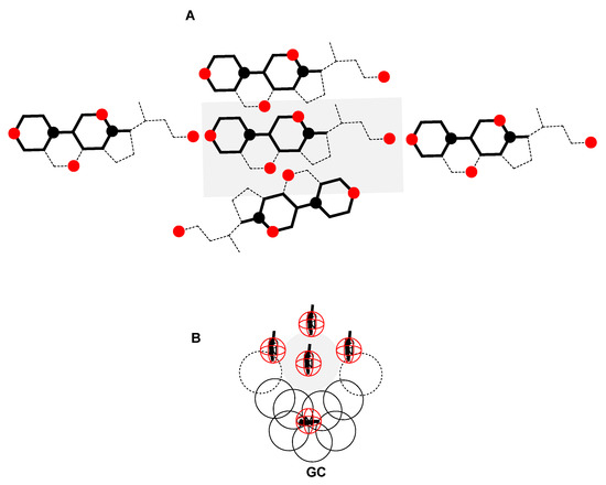 In the 2D lattice as a model for the binary mixed micellar pseudophase, if, for example, the anion of cholic acid (Figure 1 and Figure 3) is considered as a central particle (SC), then in the first part of the 2D lattice between the first neighbors SC-DTAB (DTAB—classic surfactant) there will be an intermolecular interaction (the interaction between the quaternary ammonia group (cation, DTAB) and the carboxylate group (anion, SC)) that will differ from the intermolecular interactions of the first neighbors in the second part of the 2D lattice (interactions between the quaternary ammonia group (cation) and OH groups (dipoles, SC)). Therefore, the symmetry in the spatial distribution of the energy of intermolecular interactions in the 2D lattice of classic surfactants (Figure 2) is no longer present (Figure 3). However, with cholic acid anions (and bile salts with similar geometry), DTAB surfactants can simultaneously form intermolecular interactions with the carboxylate group and with the pseudo-axial C3 OH group, which is not sterically shielded [23,24,33]. Therefore, the 2D lattice of SC-DTAB intermolecular interactions can be viewed as two separate 2D lattices, one in which there are only intermolecular interactions of DTAB and the carboxylate group of SC and the other with intermolecular interactions between DTAB and the C3 OH group of SC (Figure 6).