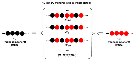 and which originates from the entropic contribution [6,7,35,36]. Since the enthalpy change is zero for an ideal binary mixture, the second term in Equation (37), according to expression (1), corresponds to the molar excess Gibbs free energy, i.e., in RST to the molar excess enthalpy [7,8,9]. Namely, according to RST, in a binary mixture, different particles are randomly mixed, i.e., every microstate from the set of all microstates is equally likely—a permutation with repeating elements and (Figure 12). In addition, the approximation is taken that the conformations of surfactants in the binary micellar pseudophase are identical to those in the monocomponent state. Therefore, the molar excess entropy () is 0: