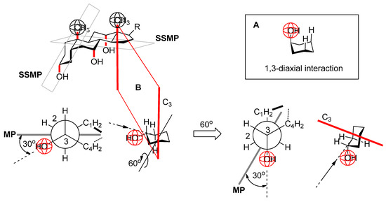 A: the axially oriented substituent (OH group) in the cyclohexane ring in the chair conformation is in a 1,3-diaxial interaction with the axial hydrogens (repulsive steric strain equivalent to van der Waals strain); B: equatorially oriented substituent (cyclohexane in chair conformation) has no 1,3-diaxial steric strain (no synclinal or synperiplanar interactions in the Newman projection of the C3–C2 bond) by rotating the cyclohexane ring by 60° degrees (counter-clockwise) about the axis that is normal to the C3 symmetry axis of cyclohexane (in the chair conformation without a substituent), the A ring of the steroid skeleton is obtained which is cis connected to the B ring, whereby the equatorial OH group (in the isolated ring of cyclohexane) is parallel to the axial OH groups—pseudo-axial C3 OH group without steric strain unlike true axial OH groups (MP = mean plane of cyclohexane; SSMP = steroid skeleton mean plane).