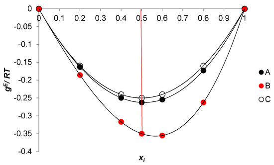 where is the enthalpy share parameter (Appendix B). Considering the molar excess entropy Function (53) and the molar excess enthalpy function (49), the excess molar Gibbs free energy is (with application [43]):