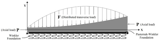 One of the important factors affecting the deformation properties of beams is the foundation on which the beam rests or the medium around the beam. The density of the medium causes a buoyant force that affects the beam’s upward characteristics. Foundations are used also to control and change the deformation of the loaded beam depending on the application in which the beam is being used. Several types of elastic and viscoelastic foundation theories have been derived, such as the Winkler model, the Filonenko–Borodich Foundation, the Hetenyi Foundation, the Pasternak Foundation, the Vlasov Foundation, the Reissner Foundation, and Boussinesq’s type foundation [14]. Winkler’s foundation is described as a single parameter model similar to a liquid base or a net of equally-spaced equivalent springs, but Pasternak’s foundation is a double-parameter model which adds the effect of shear interactions inside every spring. The applications of elastic foundations supporting beams are several, including geotechnical systems, roads, railroads, and biomechanical systems.