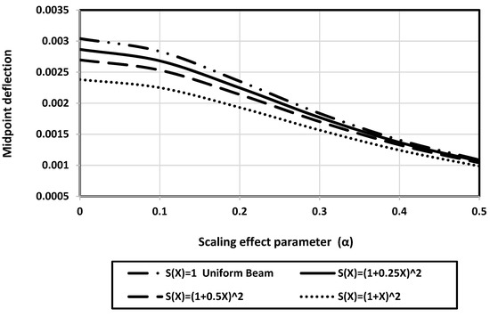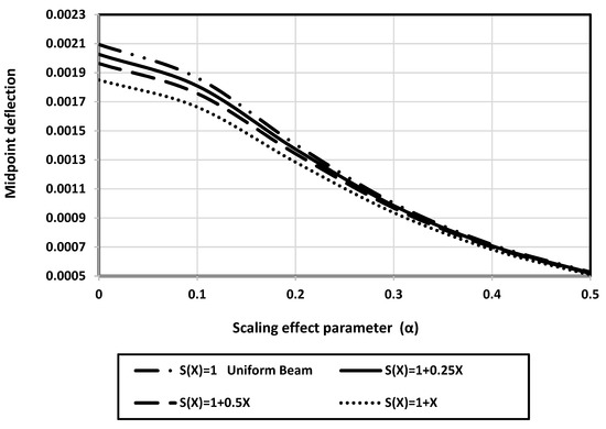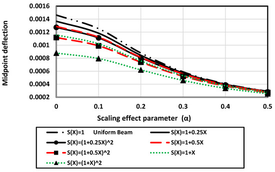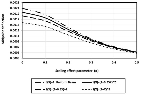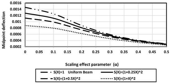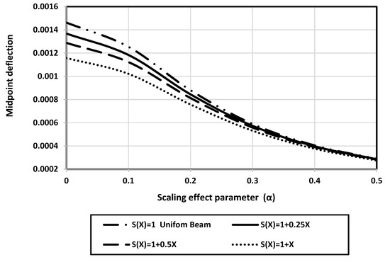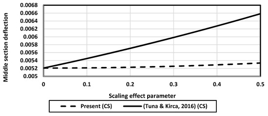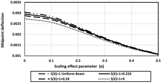 - It was found that the nondimensional deflection of the nanobeam is reduced with the decrease in the scaling effect parameter of the nanobeams.