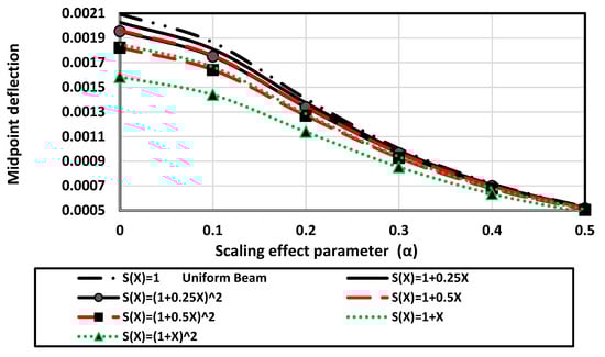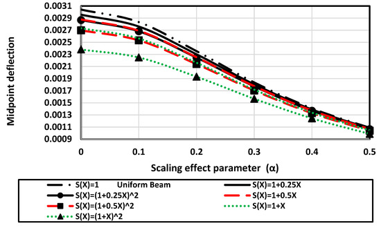 From Figure 13, Figure 14 and Figure 15, the following can be noted. First, the midpoint deflection of the non-uniform nanobeam decreases in comparison with the uniform nanobeam. Second, the midpoint deflection decreases with the increase in or the increase in .