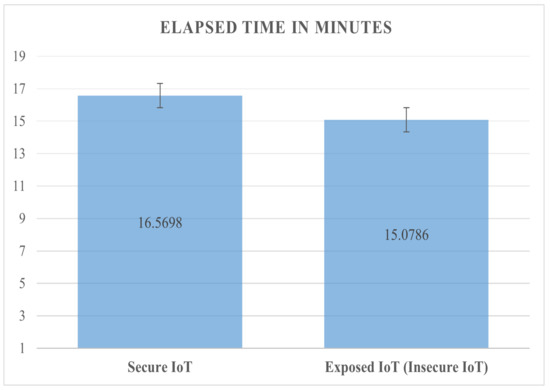 Figure 5 depicts a comparison of the amount of time passed in two different scenarios in an urban macrocell; the first scenario is a secure NB-IoT network (using the suggested cryptosystem) and the second scenario is an unsecure NB-IoT network (without giving any thought to security). Both of these scenarios take place until most cell devices in NB-IoT networking are dead, i.e., depleted batteries (around 300 rounds). Plain communications were sent in the insecure NB-IoT attocell, regardless of whether or not eavesdroppers or adversaries were present in the public network. All communication and processing expenses in the secure NB-IoT attocell design were taken into account. Operation and transmission costs in the presence of the proposed scheme are 16.5698 min, compared to 15.0786 min without any cybersecurity measures, i.e., exposed NB-IoT. This shows that the suggested scheme only adds 1.4912 min to the total time. Consequently, a delay of this magnitude is trivial in comparison to constructing an NB-IoT attocell network that is secure.