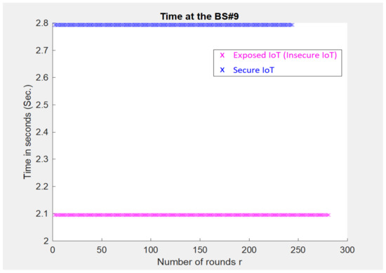 Figure 7 compares the delay times at BS number 9 for the insecure and secure NB-IoT networks in seconds, which are 2.1 and 2.8, respectively. In the secure NB-IoT network, however, there is no considerable delay.