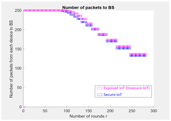 A comparison of the number of packets transmitted from each cell device to the BS (throughput/data rates) for secure and exposed NB-IoT attocell is depicted in Figure 8 and Figure 9. In light of the suggested cryptosystem, the number of packets (throughput) remains high.