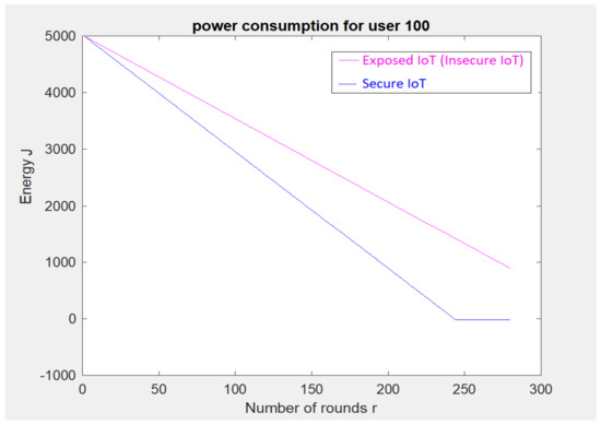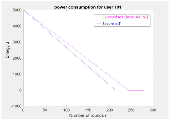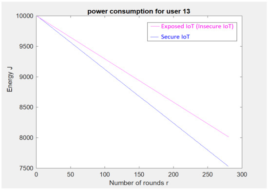Figure 10, Figure 11 and Figure 12 illustrate the comparison of the energy consumption profiles of cell devices no. 101, 100, and 13, respectively, in both scenarios. Therefore, the battery health and charge levels of a cell device are handled effectively, as can be shown in these examples. This means that, in the presence of the proposed cryptosystem, there is no major overhead expense besides preventing adversarial assaults on IoT networks.