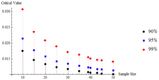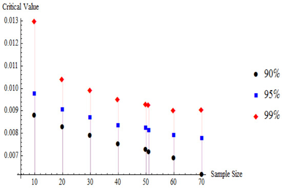 Using Mathematica v. 12, the critical values of the Monte Carlo null distribution at and 10,000 replications from ED are shown. The empirical results can be sketched in Figure 2. Table 4 and Figure 2 show that the critical values increase as the confidence level increases and decrease as the sample sizes increase.