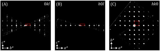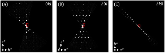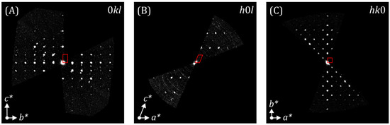 (A) 0kl, (B) h0l and (C) hk0 sections of the reconstructed diffraction space of LiAl0.8Fe0.2(SiO3)2 from PETS2. The red markers represent the projected unit cell along the respective unit cell axes. a*, b* and c* are the reciprocal unit cell axes.