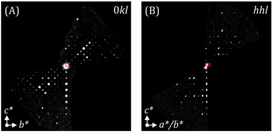 (A) 0kl and (B) hhl sections of the reconstructed diffraction space of BaCu2 from PETS2. The red squares represent the projected unit cell along the respective unit cell axes. a*, b* and c* are the reciprocal unit cell axes.