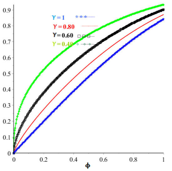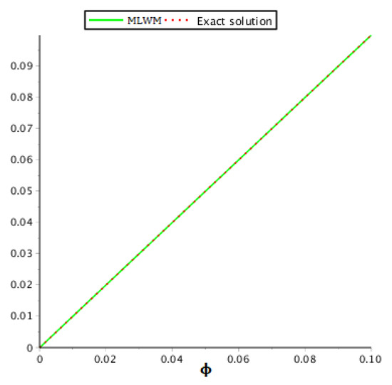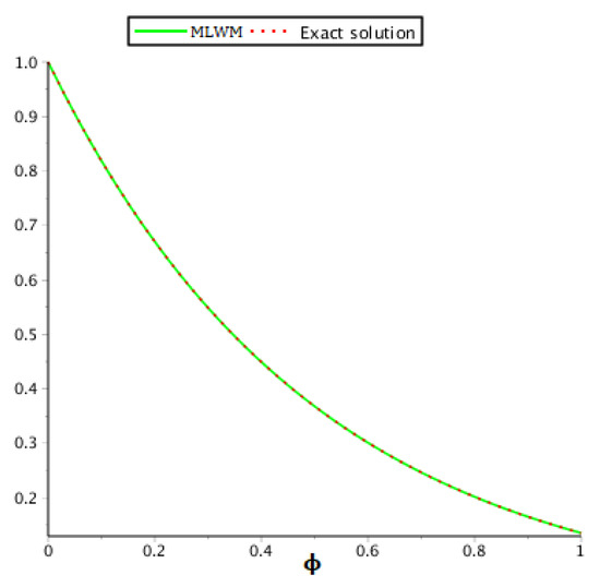 The exact solution and MLWM results at are drawn in Figure 5. The exact solution, MLWM solution in addition to relative error and absolute error are given in Table 3 whereas Table 4 gives the absolute error comparison of MLWM and MDTM at which confirms that MLWM converges rapidly as compared to MDTM. For the comparison, we take significant digits up to 20 to attain a more precise solution. In Figure 6, we demonstrate the error comparison of both approaches whereas the absolute errors at various fractional-orders are illustrated in Figure 7. Furthermore, the fractional-order solutions graph of the suggested technique are illustrated in Figure 8. The solutions of the proposed technique are in better agreement than the MDTM technique for this problem.