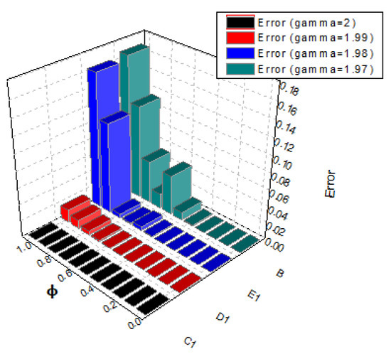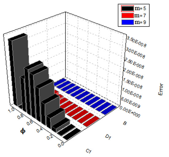 For the given problem, we consider that and . The exact solution and MLWM solution at are illustrated in Figure 1. Furthermore, the absolute errors at are illustrated in Figure 2, whereas the absolute errors at different fractional orders are illustrated in Figure 3. Furthermore, Figure 4 illustrates the fractional-orders solution graph of the suggested technique. It is confirmed that the absolute error approaches to zero as the value of m increases. The exact solution, MLWM solution in addition to the relative error and absolute error are given in Table 1. The results of the present method are compared with the discontinuous Galerkin (DG) approach [44] in Table 2 which confirm that MLWM shows quick convergence as compared to the DG method for this problem.