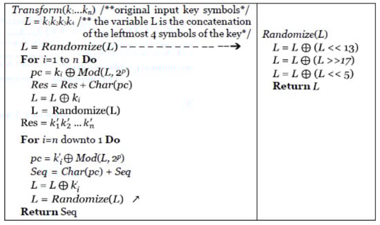 The paper proposes the routine Algorithm 1 for computing key-dependent values for the two parameters using the Equations (2) and (3) and Transform (.) subroutine (Figure 1). The subroutine Transform (Figure 1) plays a vital role in deeply manipulating the key (n symbols) and producing a new sequence with n symbols but with a higher entropy. It uses a random behavior (subroutine Randomize ()) and an XOR operation to produce values pc’s that result from XORing the input key symbol with p bits extracted from the rightmost of L using the division remainder operator (Mod). Observe, the variable L accumulates the effect of all the previously processed symbols due to the way it is updated. This effectively enables the previous symbols to influence the transformation of the symbol being processed. Additionally, thanks to the randomization of L, the influence of the previously processed symbols induces high confusion, making the transformation produce very different sequences.