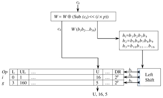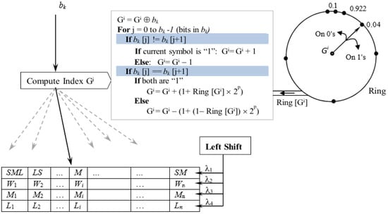 Prior to processing any new input symbol bk+1, the array’s rows are left shifted using the value to which the pointer Gi is currently pointing. For instance, if Gi is currently pointing to value γ (0.λ1λ2…λm) ∈ (0, 1), the rows 1 through 4 are left shifted by λi (i = 1, 2, 3, 4). Note due to the specific way in which Gi is calculated, changes in any input symbol will affect all the subsequent values of Gi. Furthermore, due to the left shifting after processing each input symbol, the indexing outcome changes for every subsequent input symbol, making the distortion operation selection highly fuzzy.