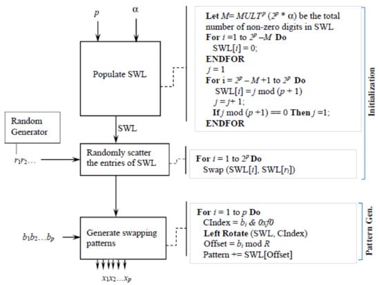 The distortion operation Swap requires swapping patterns for manipulating the bits of its input symbols. Effective generation of the swapping patterns must depend on the encryption key so that different keys produce different swapping patterns. Let us suppose that each symbol is represented by p bits. A swapping pattern consists of p integers di, where di ∈ [0…p]. For instance, if each symbol is represented by eight bits, the swapping pattern consists of eight integers in the range [0…7]. Figure 3 outlines the three stages for creating swapping patterns along with their logic. The initialization stage populates the list SWL with N = 2p integers, each integer is in [0…p]. The population stage receives two input values: α ∈ (0, 1] is the percentage of the non-zero digits in the list SWL and p is the number of bits that represent a symbol—we call α the intensity of active swapping. To give each non-zero digit that same chance to be part of a pattern, we set the number of non–zeros digits in the list SWL to M = MULTp (α ∗ N), where MULTp(x) returns the least upper bound of its argument x that is divisible by p. In this case, each non-zero digit is repeated M/p times in the list SWL. The remaining “2p − M” entries in the list SWL are zeros. After the list SWL is fully populated, its entries are randomly shuffled using a sequence of random numbers r1r2…rN. The entries of SWL are randomly shuffled by swapping the entry at index i with the entry at index ri.