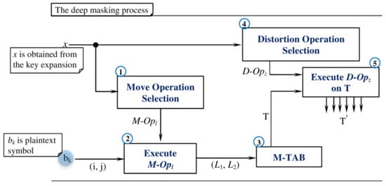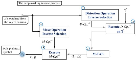 The deep masking inverse process reverses the effects of the deep masking process. That is, this inverse process restores the plaintext symbols from the masked symbols. Figure 6 shows the operations of the deep masking inverse. The logic of this process is similar to that of the deep masking process except that the order of the execution is reversed: distortion operation inverse is executed first then the substitution operation inverse. The distortion operation inverse receives the masked symbol as an input and removes the masking effect of the distortion operation (used during the masking). It removes the impact of the distortion operation by using the input x to retrieve the appropriate distortion operation inverse and executes this operation on the input symbol . The output is a new symbol T that is passed to the substitution operation inverse for removing the impact of the substitution operation as follows. The symbol T is looked up from the M-TAB and its location within the substitution space (L1, L2) is passed to action 5 for further processing. Next, the deep masking inverse process uses the symbol x to select a move operation inverse M-Op−1. The selected move inverse operation slides back from the index (L1, L2) to the original index (i, j). Finally, the bits i and j are concatenated (ij) to yield the original symbol bk.