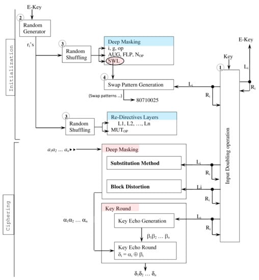 The second processing stage is the mutation operation. This operation imposes fine-grained changes to some symbols by flipping their bits according to a mutation value defined next. The mutation operation adopts a probabilistic model for selecting which of the symbols passing through must be subjected to the mutation. In such a probabilistic model, the mutation operation is activated to handle the symbol with a probability of γ ∈ [0, 1]. We call γ the intensity of mutation, where γ = 0 means no symbol-mutation, while γ = 1 means all of the symbols are mutated. To effectively implement this probabilistic model; we define a list with 2p entries. This list is populated with H (≤2p) replications of mutation operation, where H = Max (2p/4, h) and h is a random value. The remaining entries “2p − H” are populated with the NULL operation (Idempotent operation). The content of this list is randomly scattered using a sequence of 2prandom numbers. Given this list, the intensity of the mutation is defined by γ = H/2p. Note, due to the random reordering of the elements in the list, the probability of selecting the mutation operation is H/2p.