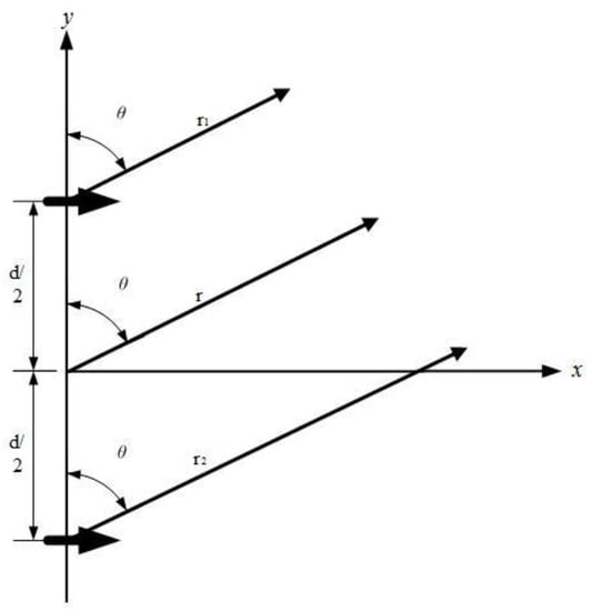 Figure 2 shows the 1 × 2 SD arrays placed parallel in the air at a certain distance. Assuming that there is only one single SD in Figure 2, when the EFc is observed at the same polarization from all angles, the radiant energy attenuation is isotropic, that is, there is no directivity. Assume that another SD with same phase is added and the two SDs are separated by a specific distance. Even if the positions of the two SDs are different, the absolute values of the EMFc signals at two positions symmetrical to the centerlines of the two SDs are the same, so the signals lack directivity. In both cases, the EMFc generated by the source is symmetric.